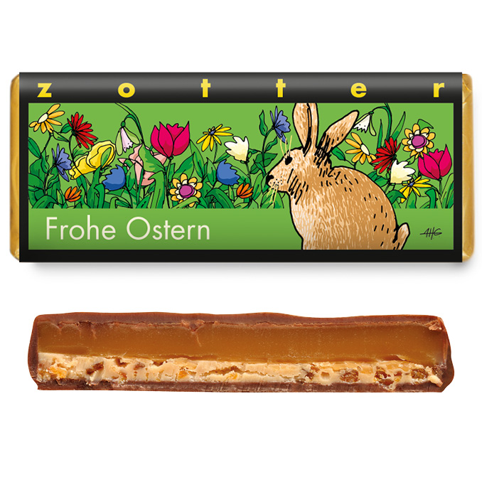 Eine süße Versuchung mit natürlichem Karamell, der mit Butter gerührt, fabelhaft gut schmeckt. Kombiniert mit einer Schicht Mandelnougat. Dazwischen tummeln sich knackige Karamell-Crispies. Umhüllt von Milchschokolade mit 50 % Kakaoanteil.