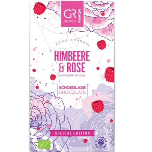 Helle Schokolade, veredelt mit aromatischfruchtigen Himbeeren und kostbarem bulgarischem Rosenöl. Die Himbeeren werden reif und mit vollem Aroma geerntet und sofort gefriergetrocknet. Dadurch bewahren sie ihr volles fruchtig-beeriges Aroma.