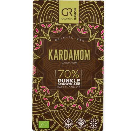 Kardamom und Kakao sind dicke Freunde. Eine wunderbare Geschmackskombination, die sich in dieser Tafel von Georgia Ramon zart und harmonisch widerspiegelt.